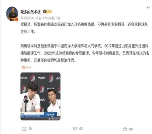 除此之外,杨瀚森身边的翻译刘禹铖近期成为球迷关注的对象,似乎比杨瀚森还要更励志。在杨瀚森饱受争议的阶段,翻译刘禹铖被网传加入了开拓者,教练组承担了重要的角色,让人意外。